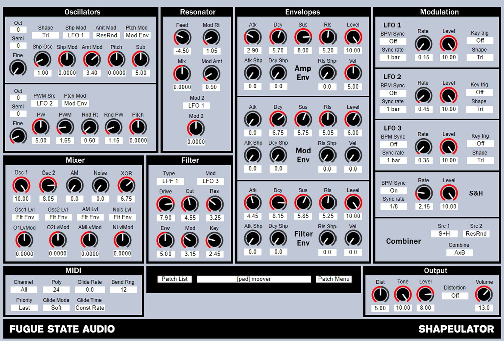 Shapeulator is essentially the product of a modular patching session, and a desire to have the core setup used available for further sound design fun. At the most basic level, it is a subtractive synthesizer, with some additional features that make it especially useful for certain types of pads, fx sounds, and synthetic percussion.